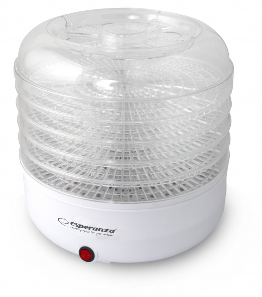 EKD001 Deshidrator Alimentar Esperanza, Putere 125 W, 5 Tavi Transparente, Ideal pentru fructe&legume, Design Modern, ArgintiuDEHIDRATOR ALIMENTAR ESPERANZA, 5 tavi transparente.Uscarea produselor este o modalitate fiabila si usoara de a le conserva, gustul si mirosul lor, precum si nutrientii valorosi si substantele vitale. Acest lucru ne permite sa ne bucuram pe tot parcursul anului de gustul fructelor, legumelor sau ciupercilor fara conservanti si fara alti aditivi artificiali. Acest dispozitiv pastreaza mai mult timp gustul si mirosul produselor tale preferate. Este esentiala in orice bucatarie moderna si sanatoasa. Este cu 125W si element de incalzire incorporat si lasa produsele sa se usuce rapid, precis si in mod egal. Datorita protectiei la supraincalzire, utilizarea acestui uscator de alimente este absolut sigura.Greutate: 2.7875 kgDIMENSIUNI