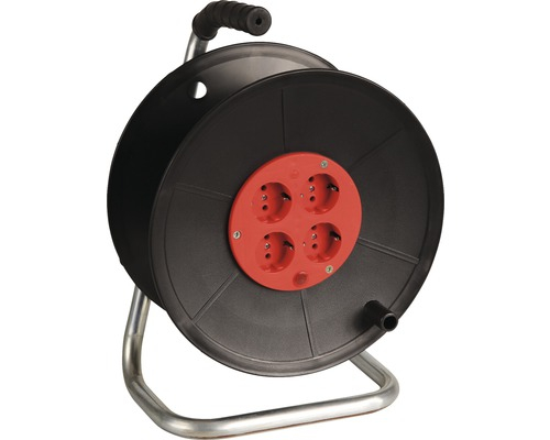 Cablu Prelungitor Datamaxx 4 prize, rola cu tambur, IP20, 3x1,5 mmp, 3500W, 50 metri, maner transport ergonomic, rosu/negru