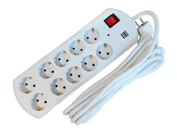 Acesta este prevazut cu 10 prize Schuko si 2 prize USB si fisa turnata nedemontabila cu contacte laterale de protectie.