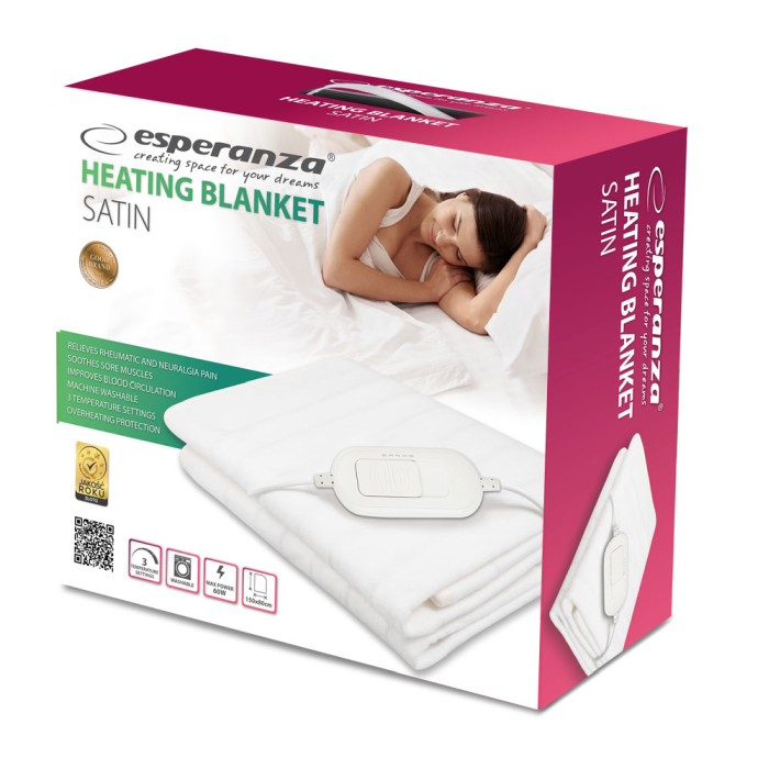 EHB002 Patura Electrica Esperanza Satin 60W 150x80 cm 2 Niveluri Incalzire AlbPerna cu incalzire electrica pentru spate si gat in zilele umede si ploioase!Comoda si usor de folosit, vesta incalzita va permite sa reglati temperatura cu cele 3 setari de caldura.Patura noastra electrica de incalzire este ideala pentru ameliorarea durerilor reumatice sau radiculare. Actiunea sa va aduce o usurare in toate tipurile de nevralgii, precum si calma muschii rigizi. Acesta va avea un efect benefic asupra circulatiei sanguine si va va imbunatati in mod semnificativ bunastarea. De neinlocuit in zilele si noptile reci. Asigurati o distributie rapida si uniforma a caldurii. Practic si placut la atingere. Dupa deconectarea stecherului, patura poate fi spalata in masina de spalat. Lucreaza in fiecare casa