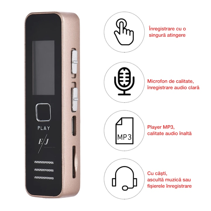 Reportofon digital, XY05, difuzor, MP3 Player, memorie 16GB, autonomie 20 ore, capacitate inregistrare 192 ore, auriuDescriere