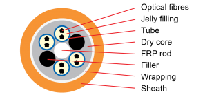 Structura: Element de rezistenta nemetalica, structura tubulara din fibra optica, blocata SZ, miez de cablu umplut cu unguent de blocare a apei, manta PE.