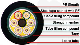In cablul GYTS, fibrele monomod / multimod sunt pozitionate in tuburile libere, tuburile sunt umplute cu compus de umplere care blocheaza apa. Tuburile si umpluturile sunt strânse in jurul elementului de rezistenta intr-un miez circular al cablului. Un PSP este aplicat in jurul nucleului. Care este umplut cu compusul de umplere pentru a-l proteja. Apoi cablul este completat cu o manta din PE.