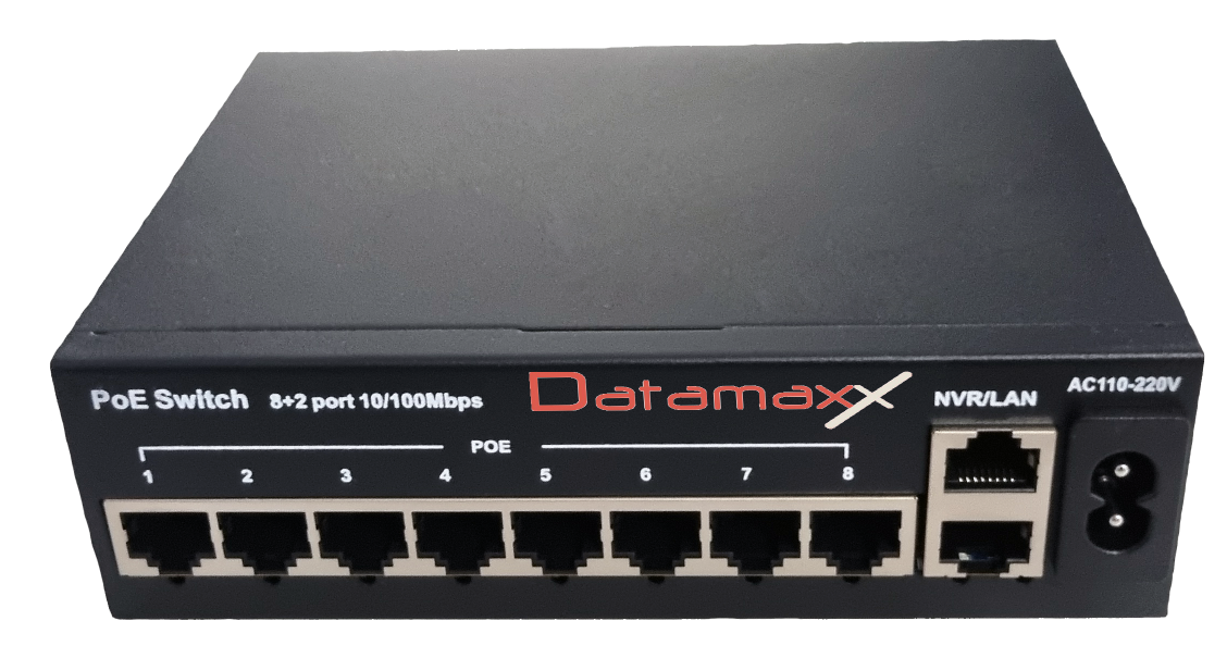 Switch-ul Datamaxx A_4178  este echipat cu 2 porturi de uplink 10/100 Mbs - 1 port pentru NVR si un port pentru conectare la router.