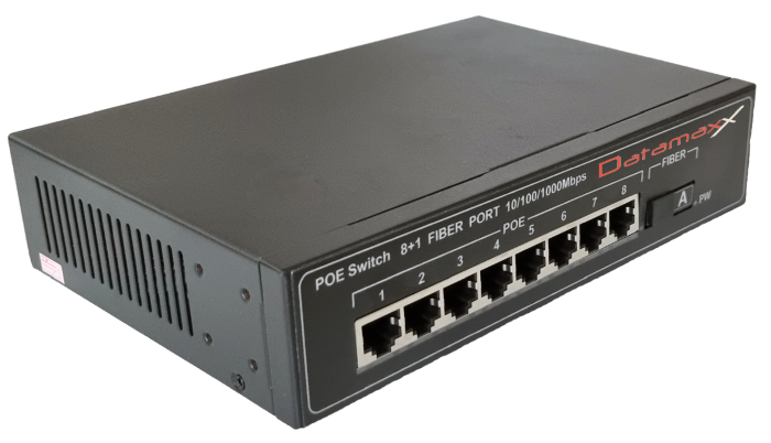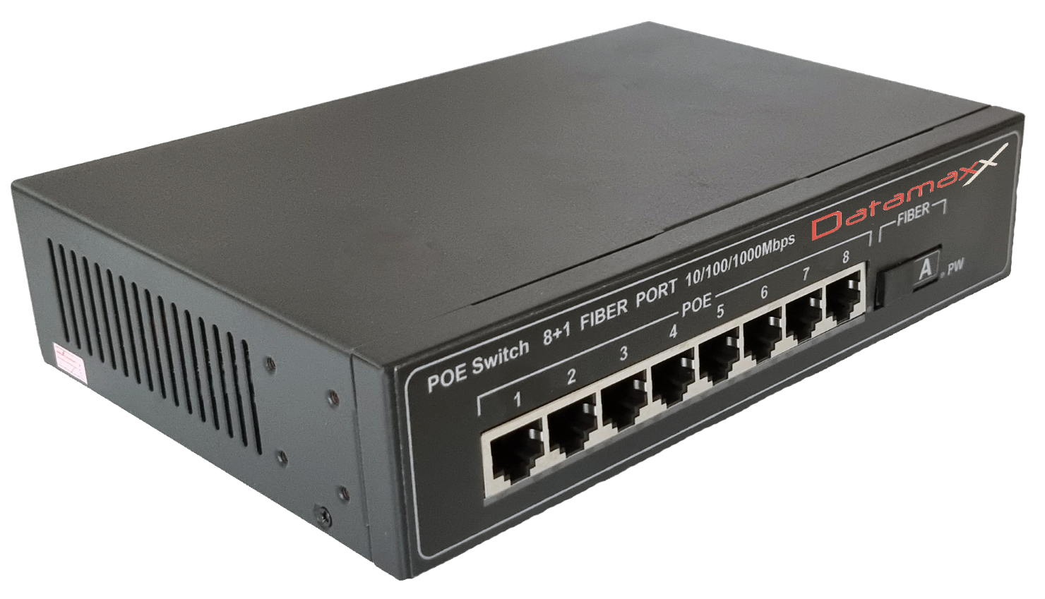 Switch-ul PoE Datamaxx A_4179 este un echipament special conceput pentru sisteme de supraveghere IP, ce permite transferul de date cu viteze de 10/100 Mbps si dispune de 8 porturi PoE+ si 1 port firba optica 1310/1550.